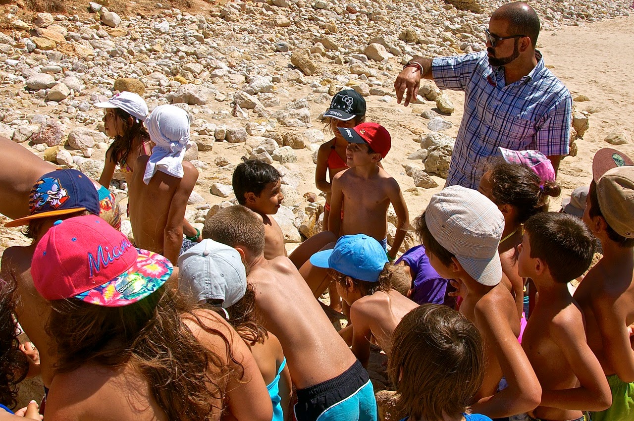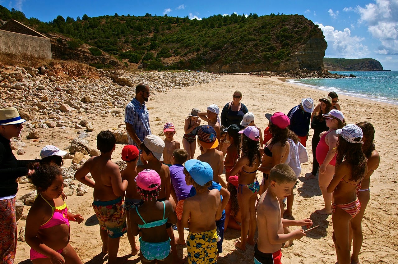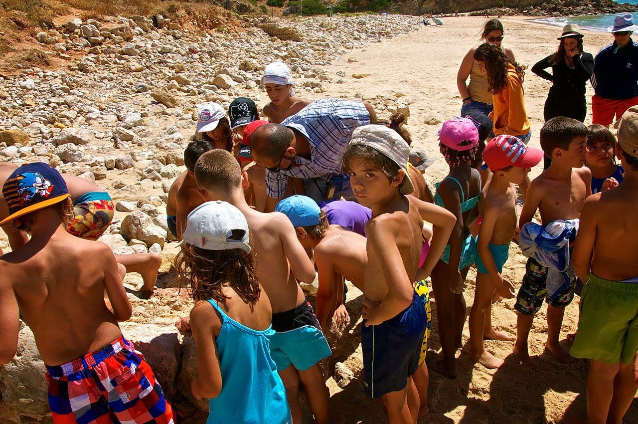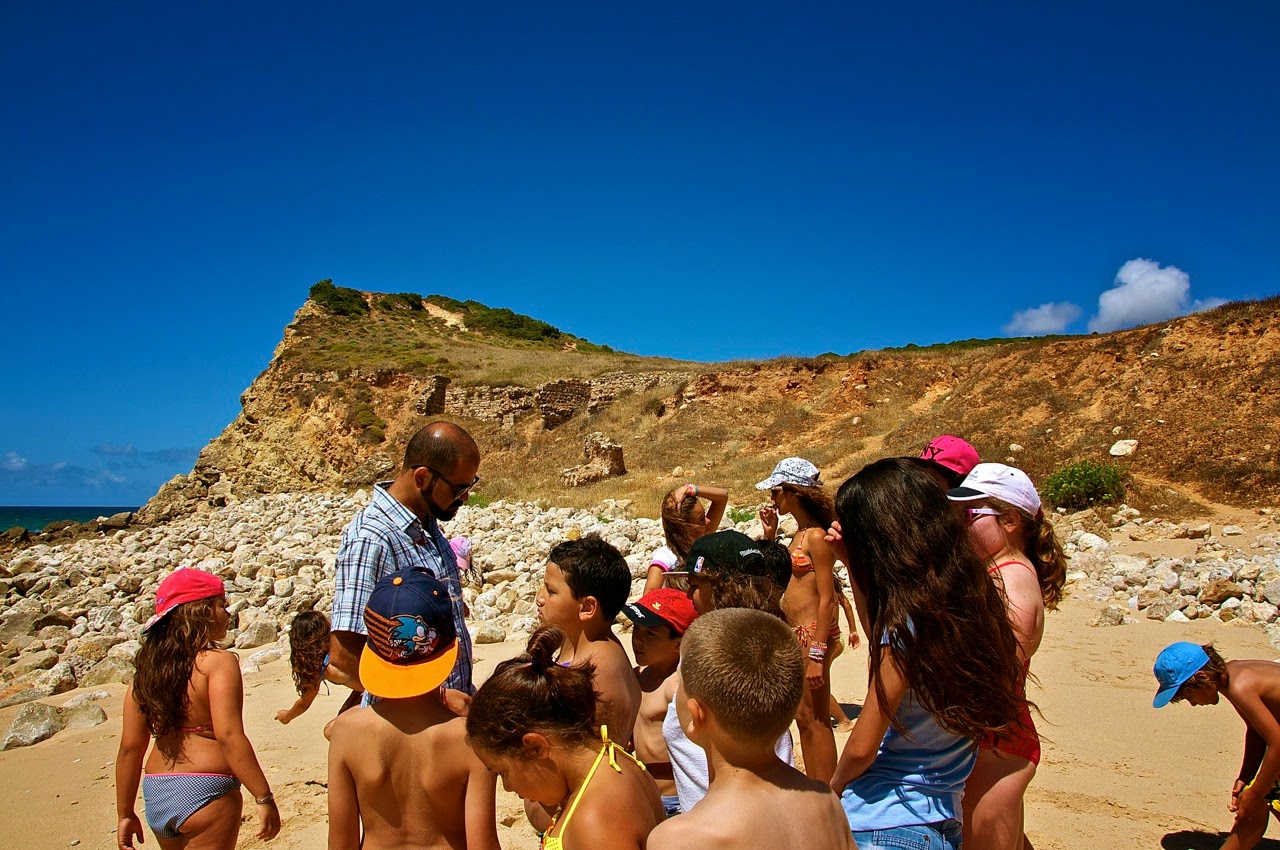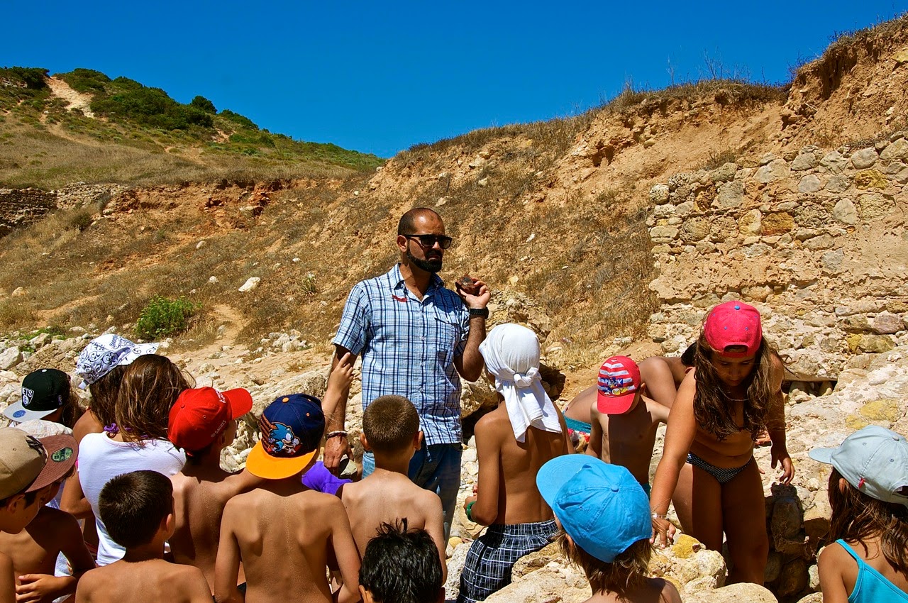 No intervalo entre mergulhos e outras brincadeiras, as crianças foram acompanhadas pelo arqueólogo municipal num passeio até às ruínas romanas, na ponta poente daquela praia. Guiadas pela força da História e pela magia da imaginação, viajaram até aos primeiros séculos da nossa Era, para lá reconstruir as actuais ruínas e assim visualizar toda a acção que por ali fervilhava: a pesca, os barcos, o porto, as casas, a fábrica de conservas de peixe, as pessoas... a vida e a herança destes nossos ilustres antepassados.